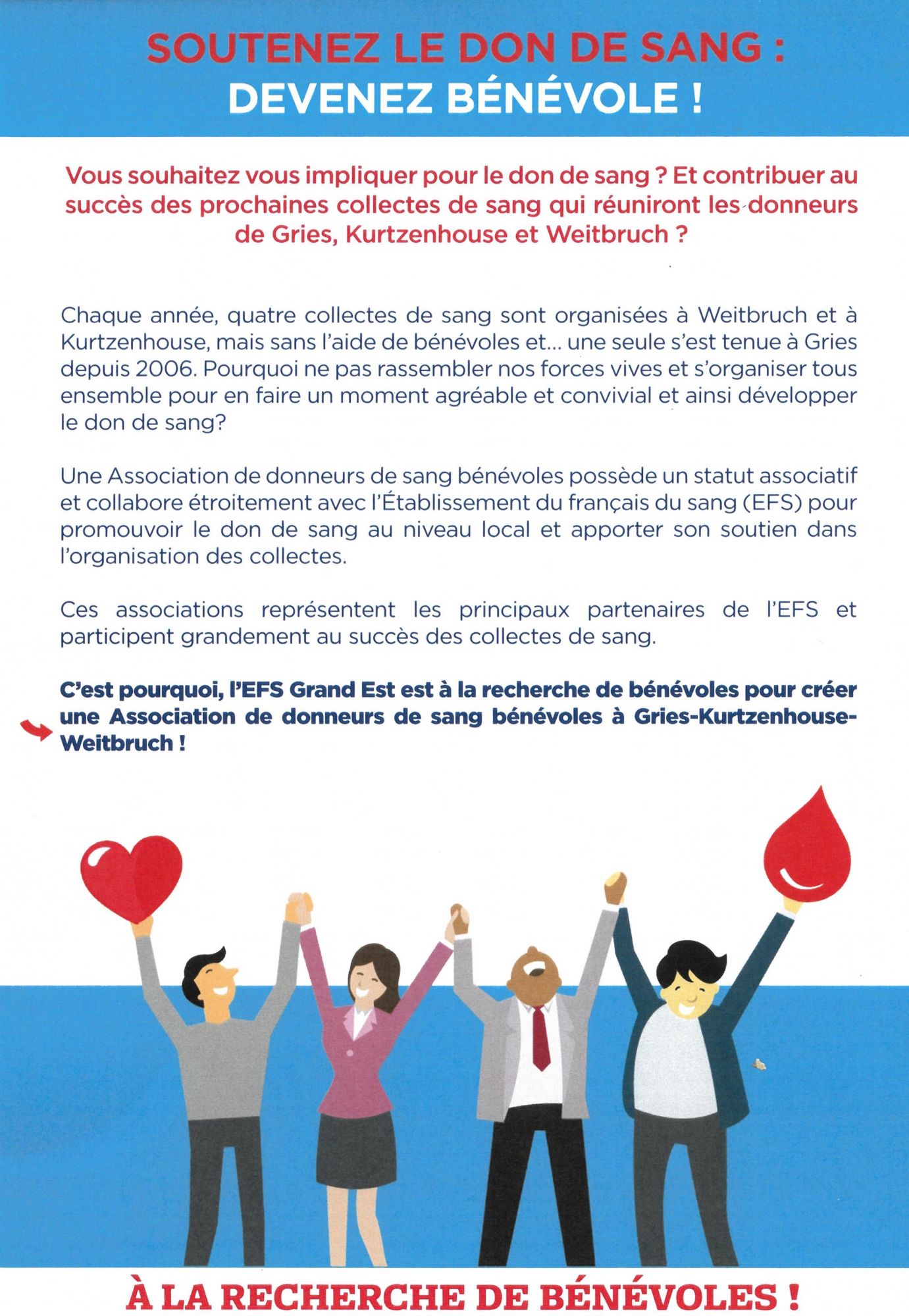 L'Etablissement Francais su Sang ( EFS ) et l'Amicale pour le don du Sang de Gries , Kurtzenhouse, Weitbruch, appellent les donneurs à se mobiliser. Renseignement et questionnaire sur https://dondesang.efs.sante.fr/.