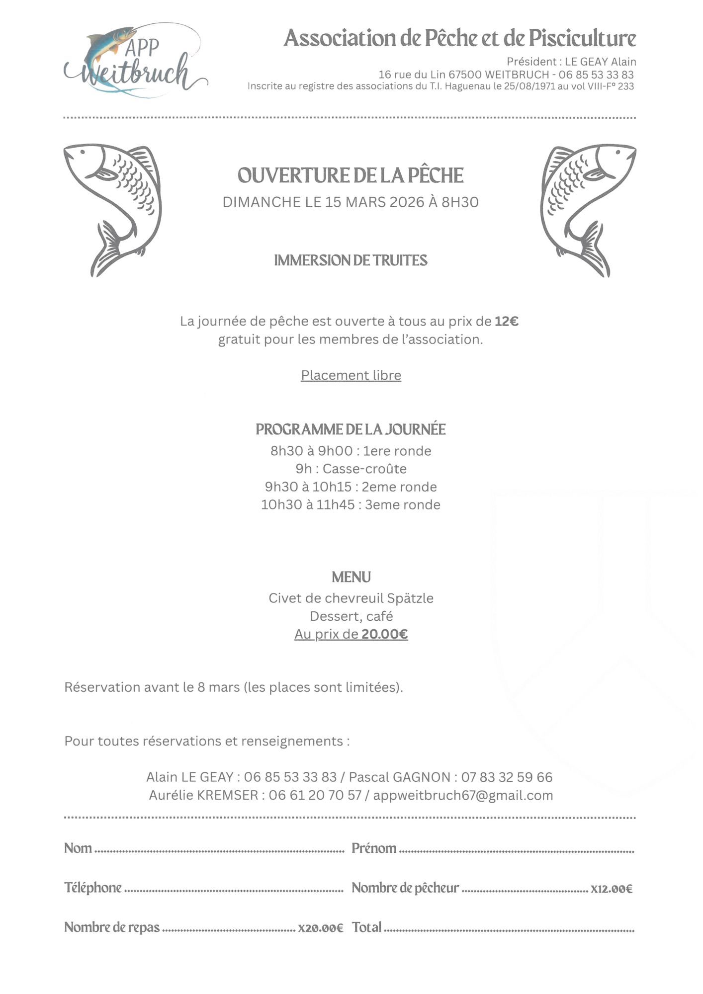 Le dimanche 1er mars 2026 se tient l'assemblée générale de l'Association de Pêche et Pisciculture. Au foyer avicole, 5 rue de l'Eau. Ouverte à tous.