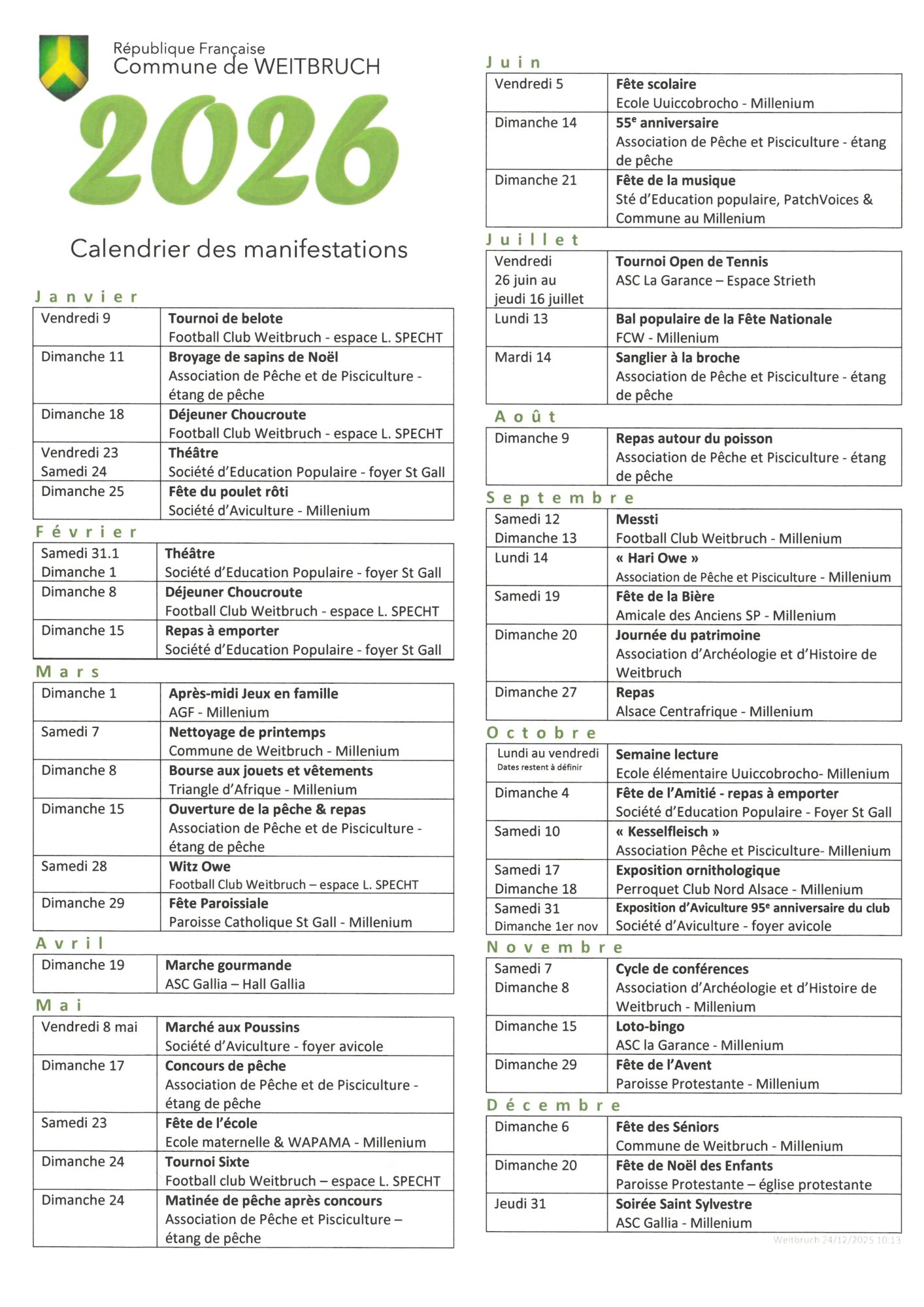 Calendrier des manifestations à jour (quelques ajustements ont eu lieu depuis sa parution dans le Magazine de Weitbruch n° 18)